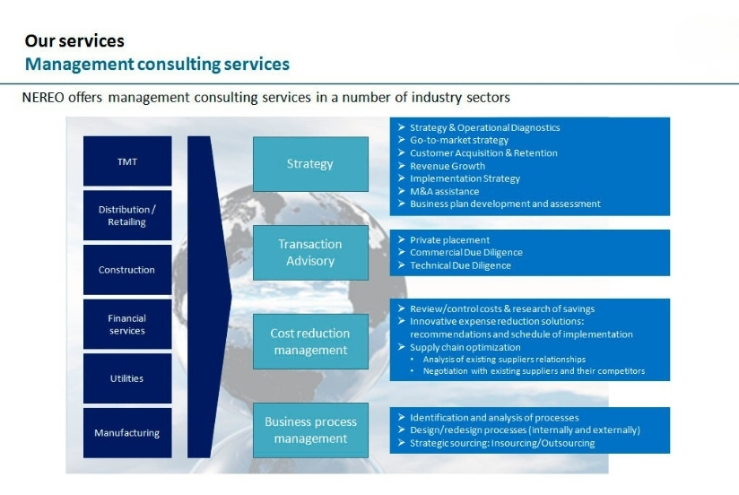 NEREO´s Management Consulting Services embrace different areas of business of a number of economic sectors.